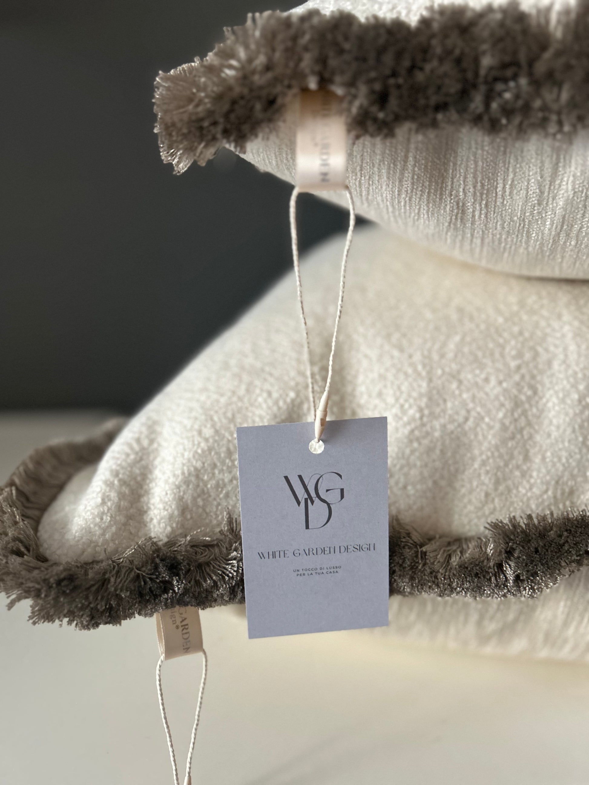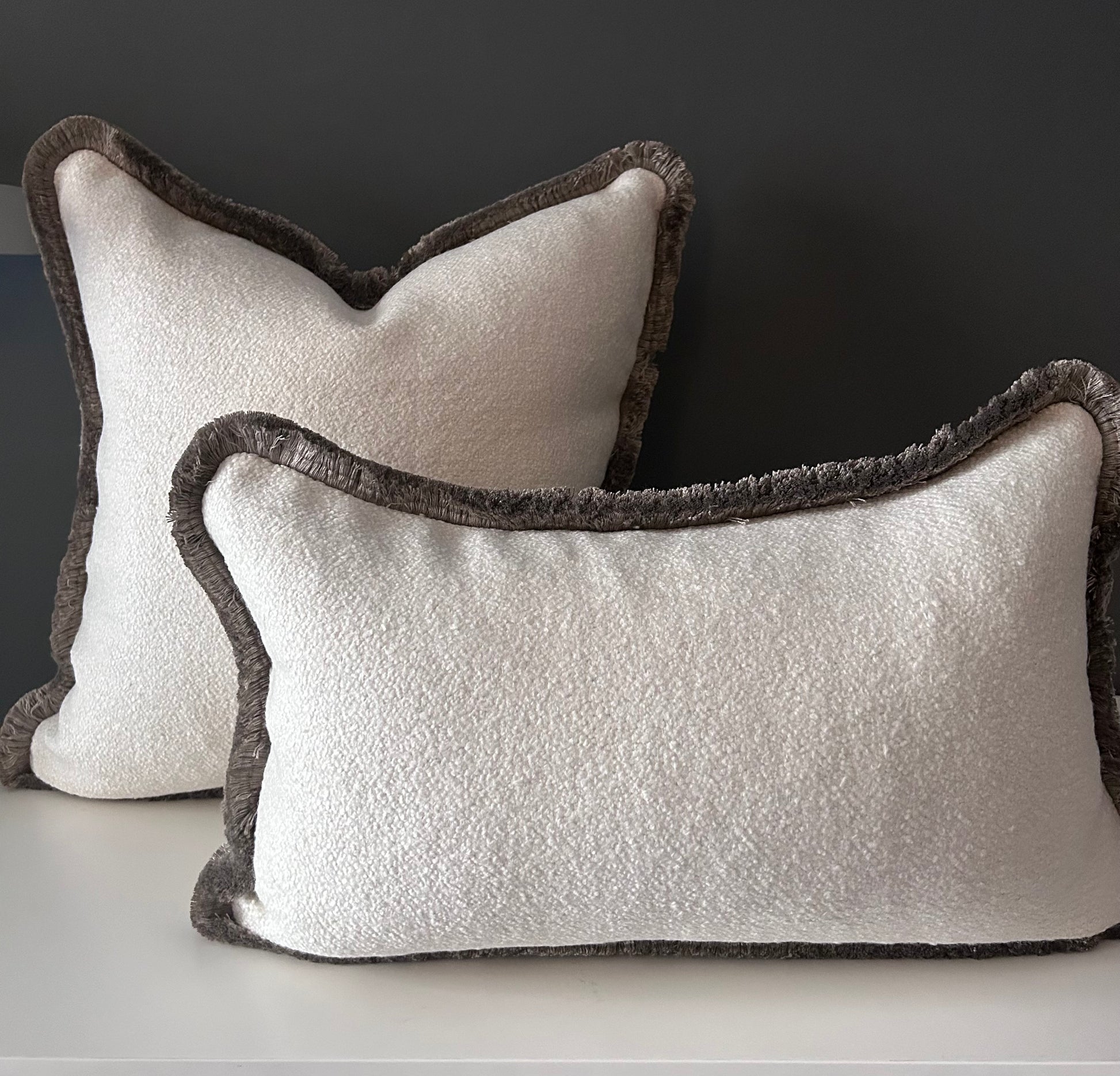 Fronte in morbido tessuto bouclè di Minotti color avorio decorato con spazzolino setoso color tortora.