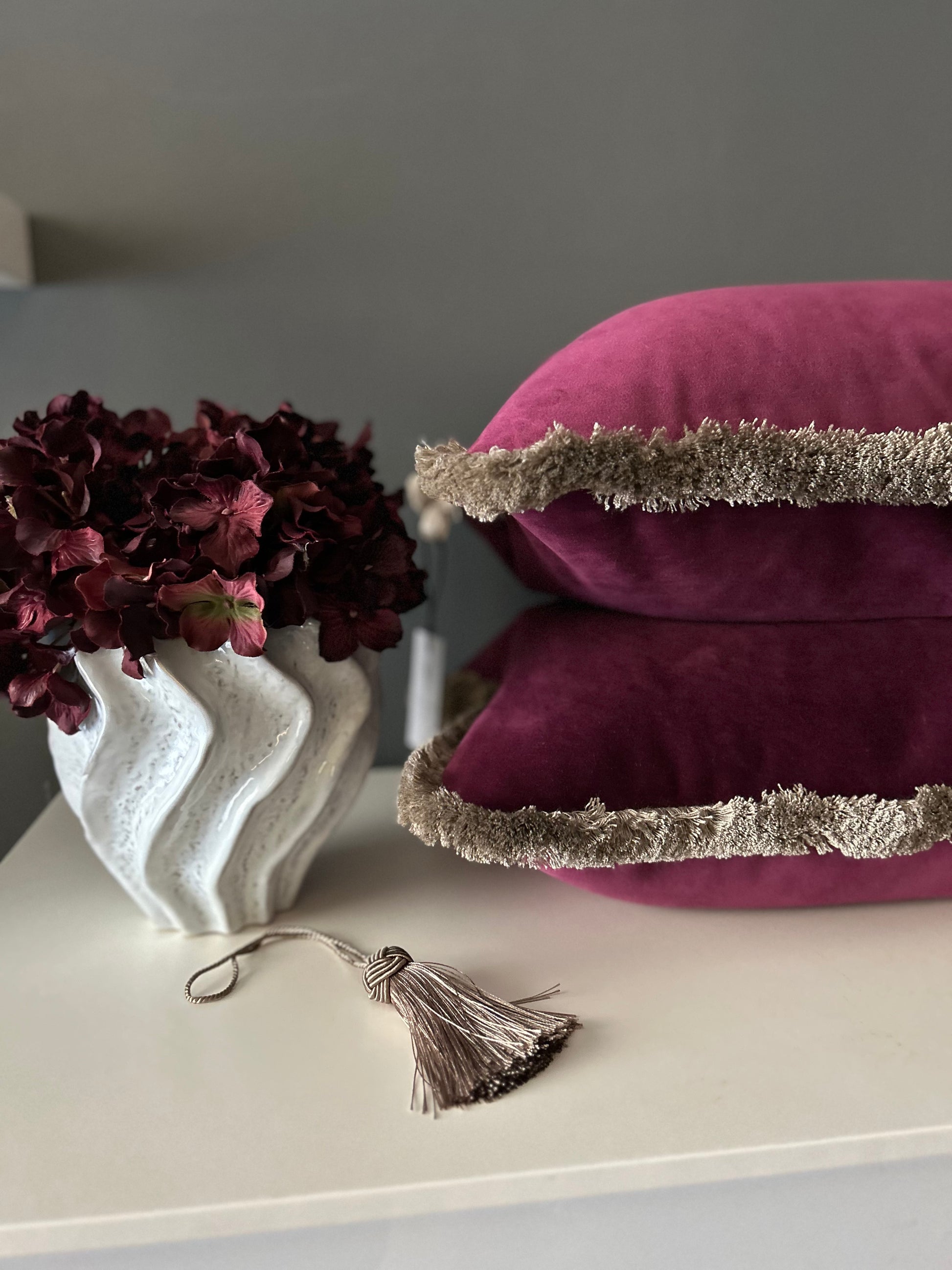 Copricuscino in morbido velluto ad alta densità di una meravigliosa tonalità viola. Decorato con un folto spazzolino in viscosa color grigio/tortora.