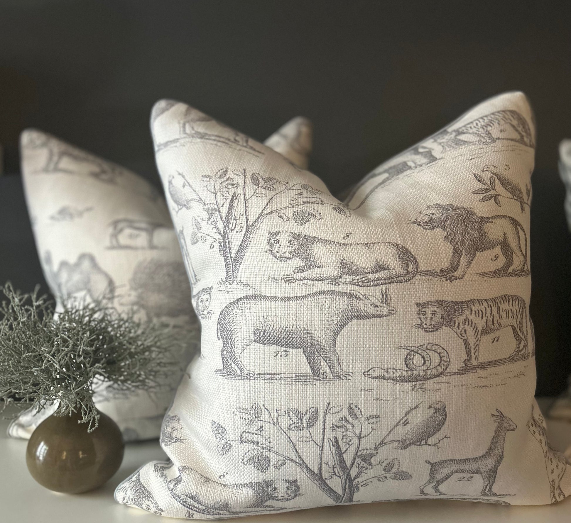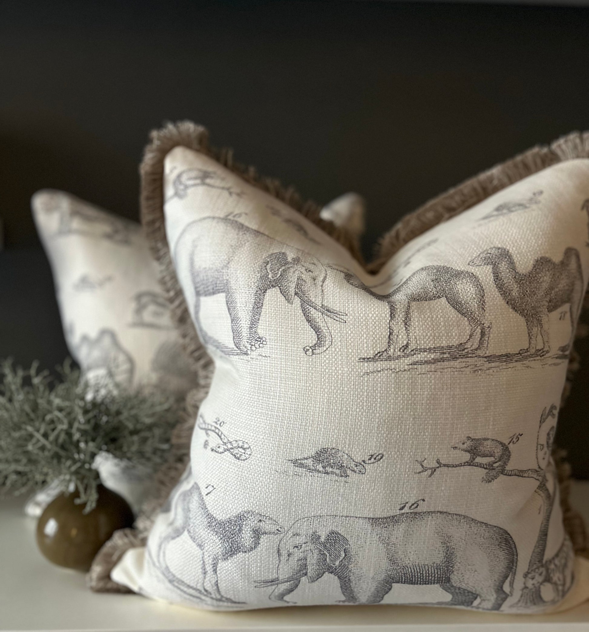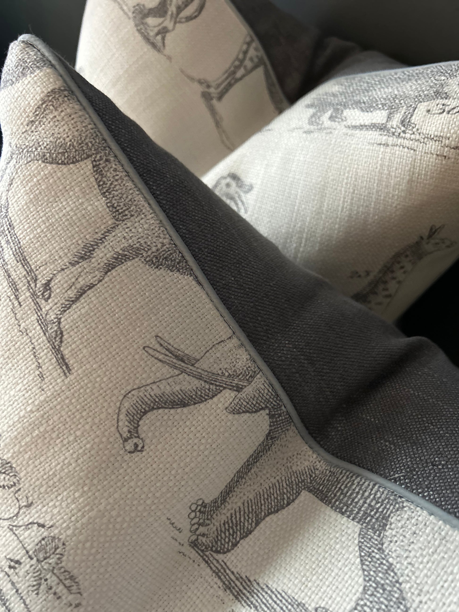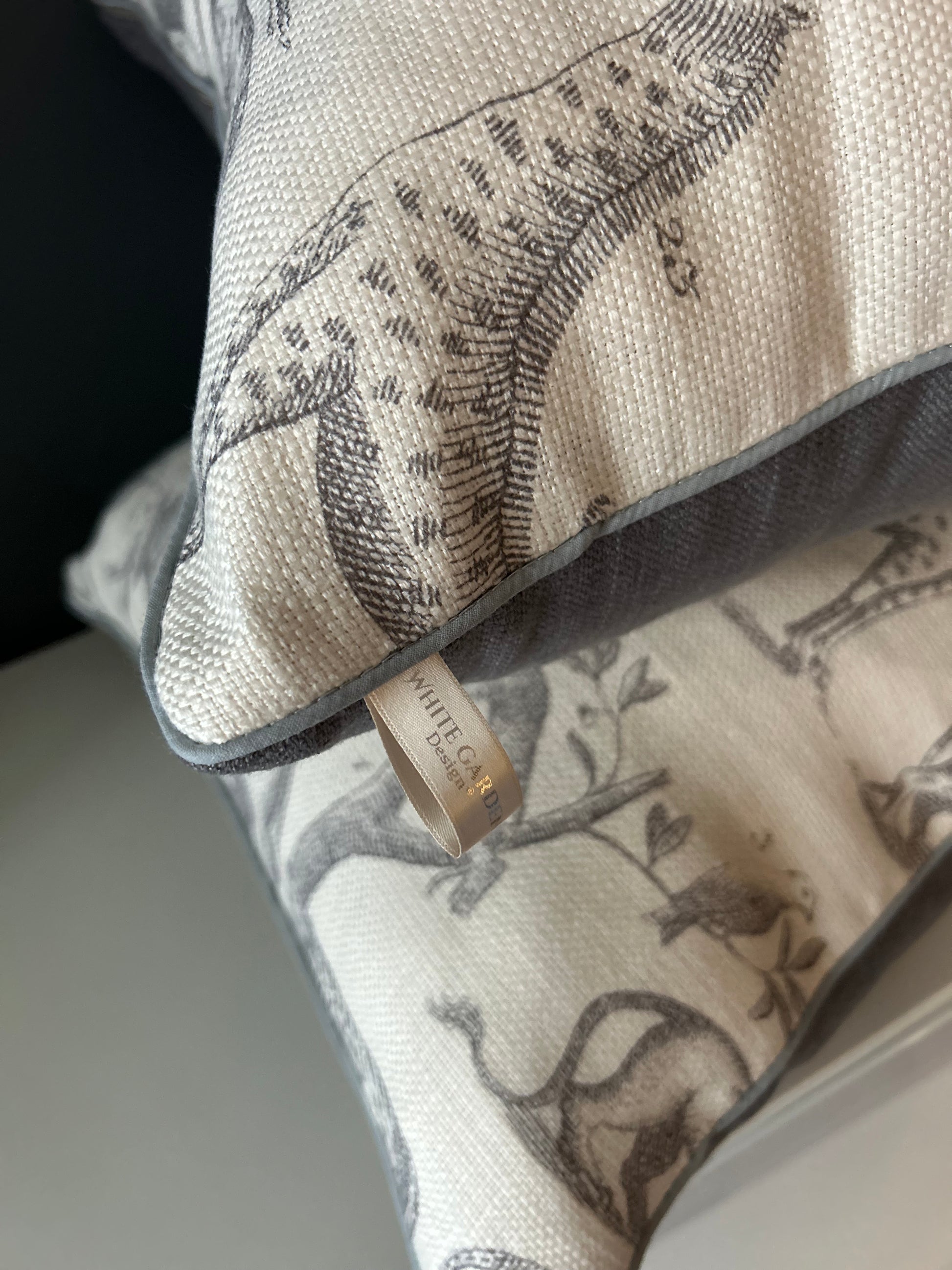 Un cuscino di design che unisce eleganza e originalità. Il fronte è realizzato in un pregiato tessuto Andrew Martin in misto lino, cotone e PES, con una trama affascinante di animali esotici su sfondo bianco/panna dal forte impatto visivo.