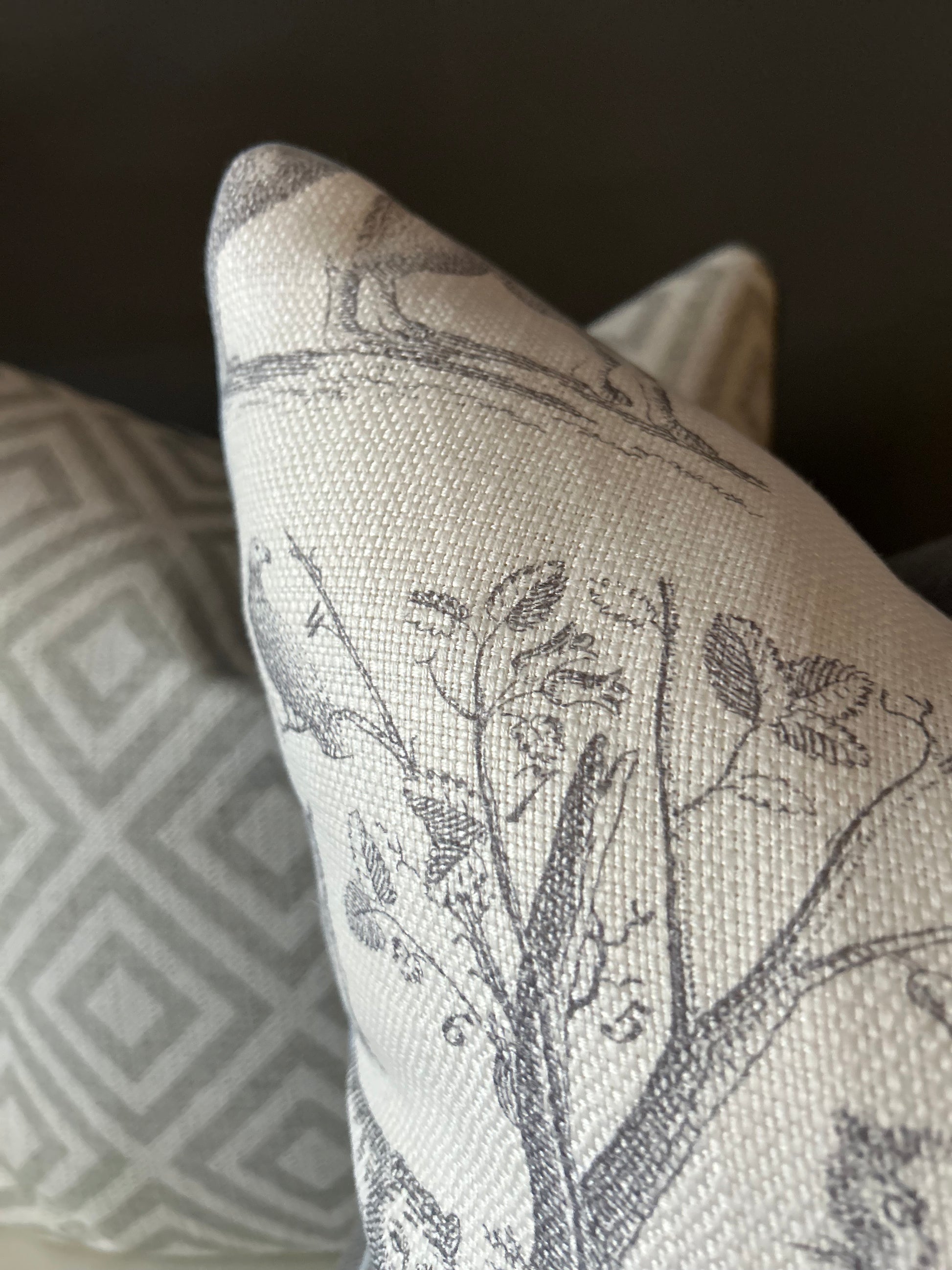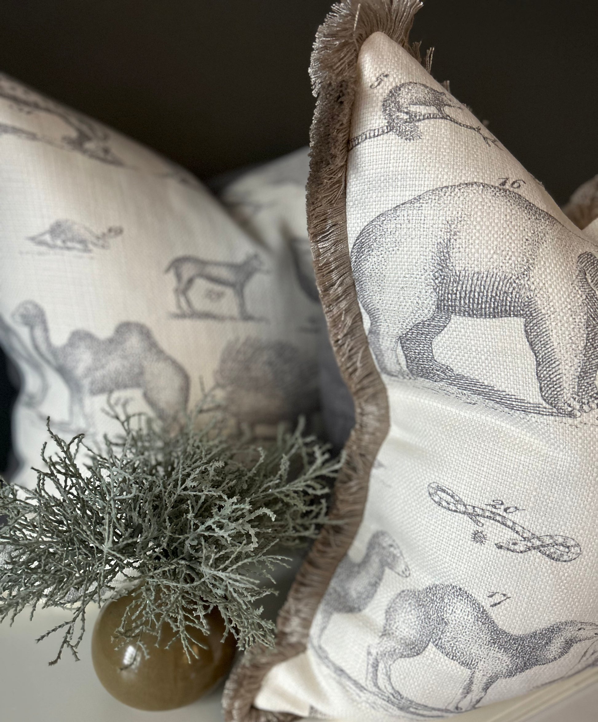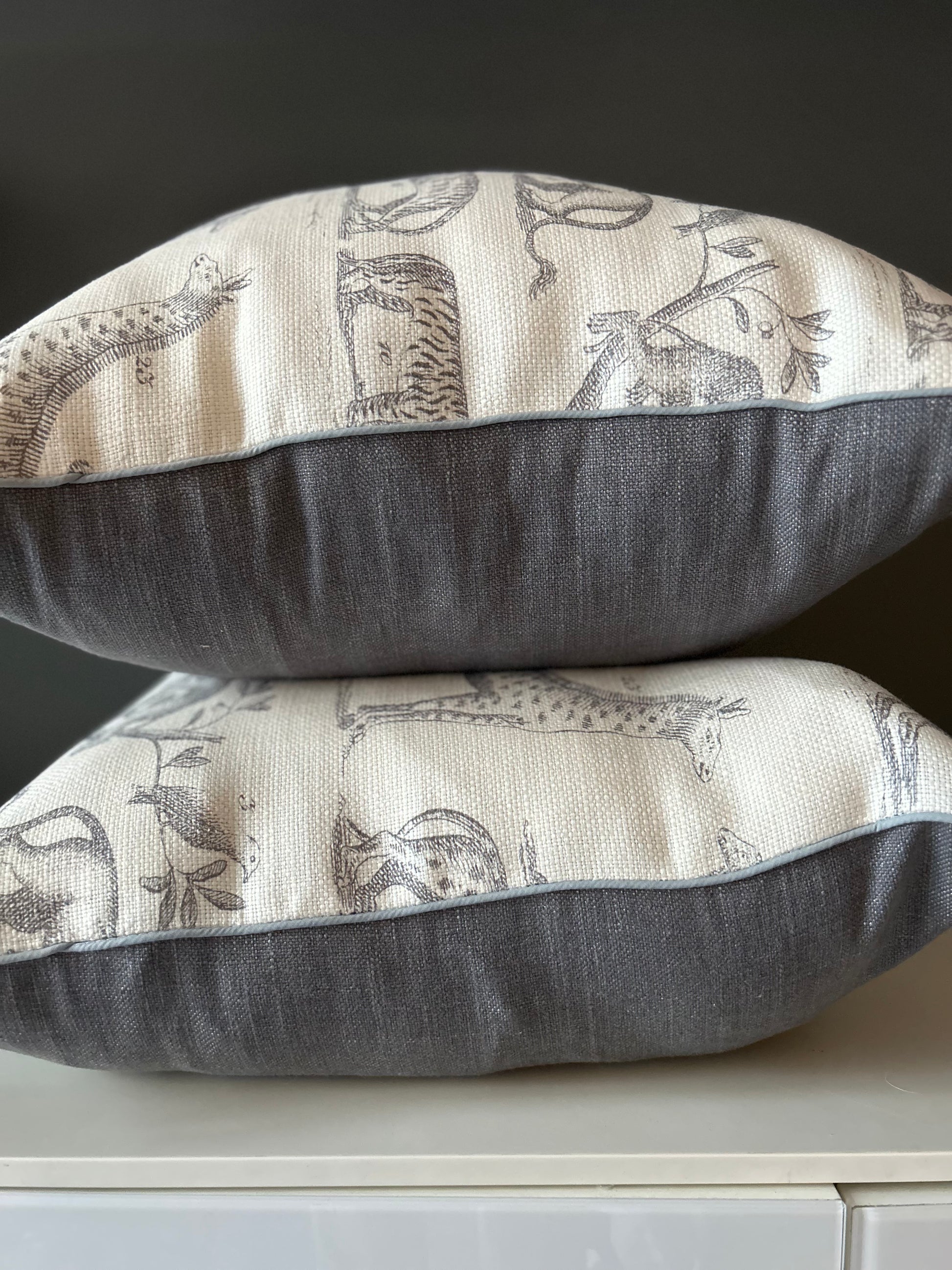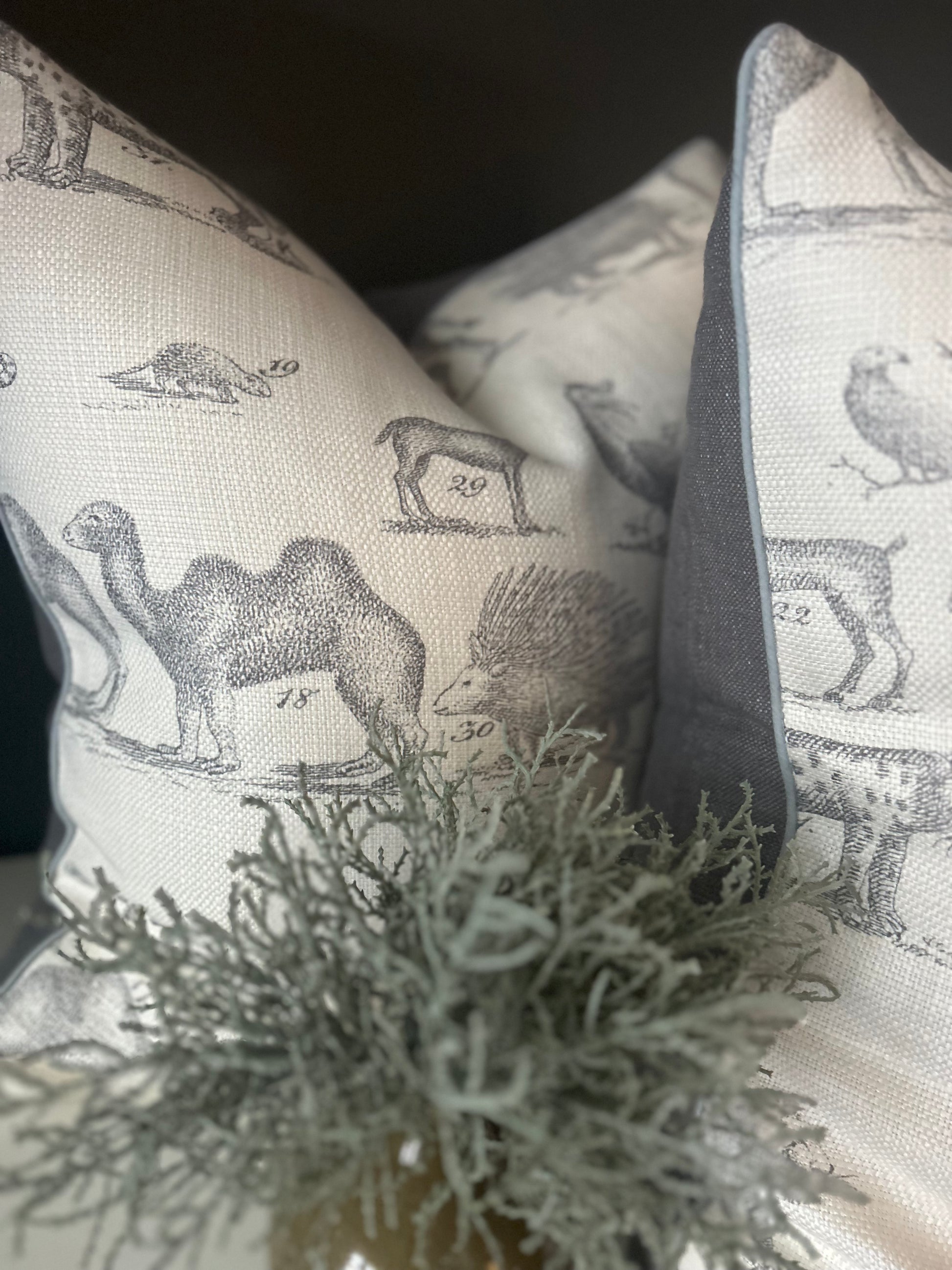 Un cuscino di design che unisce eleganza e originalità. Il fronte è realizzato in un pregiato tessuto Andrew Martin in misto lino, cotone e PES, con una trama affascinante di animali esotici su sfondo bianco/panna dal forte impatto visivo.