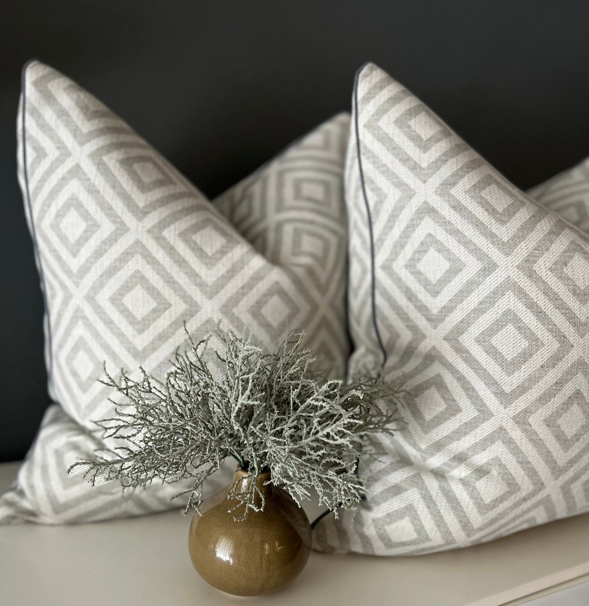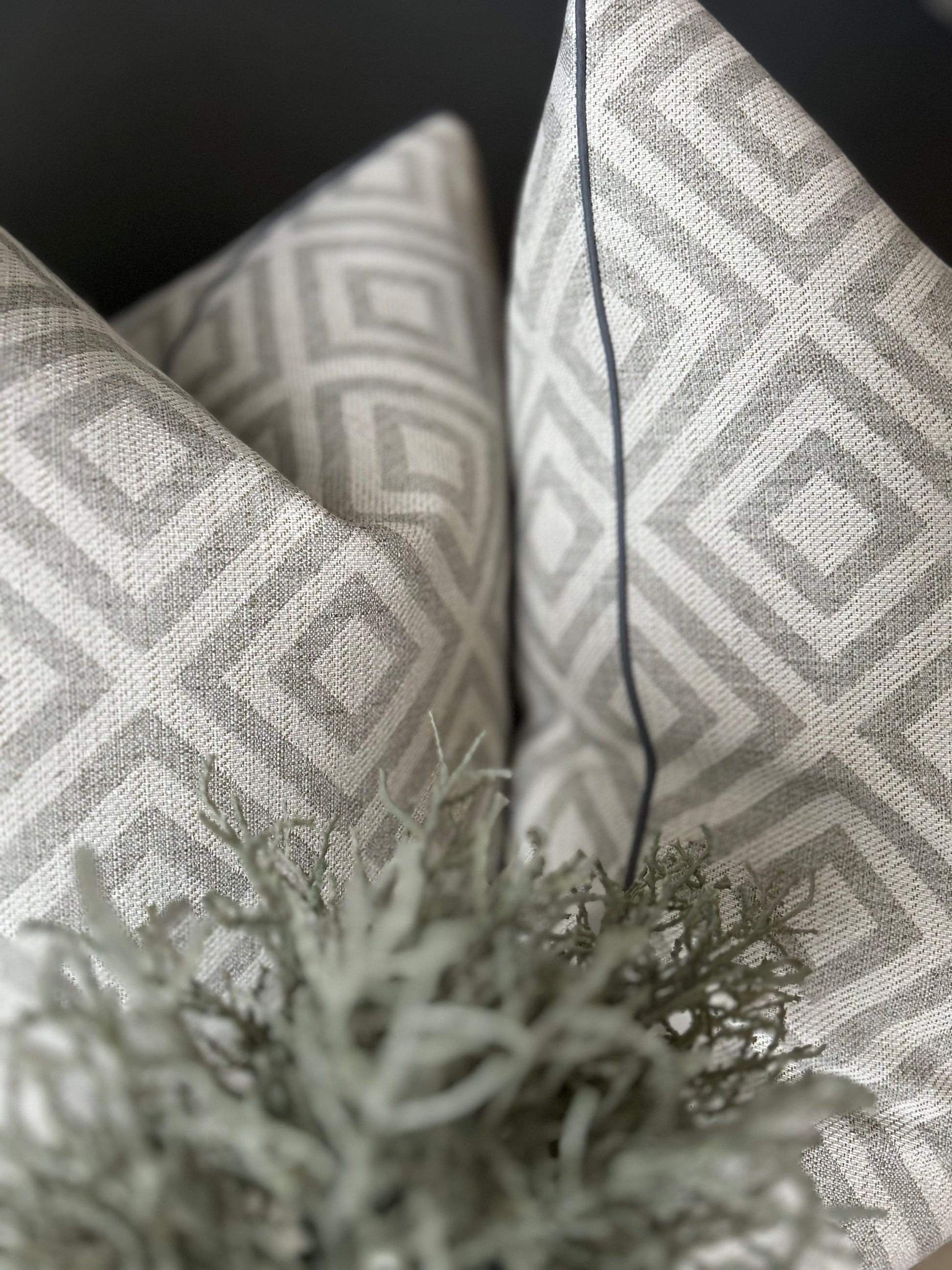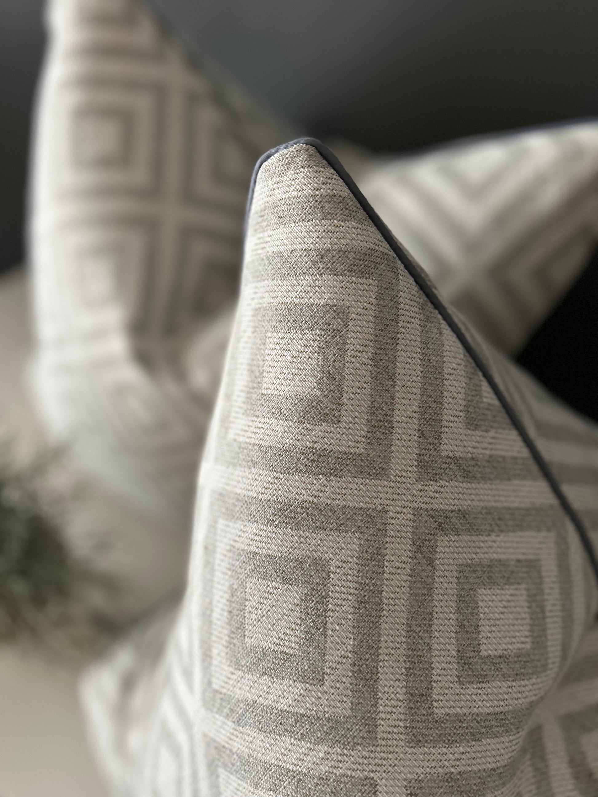 Il bordo in cotone grigio scuro rifinisce con eleganza il design, aggiungendo contrasto e definizione. Perfetto per il divano, la poltrona o il letto, questo cuscino unisce estetica e comfort.