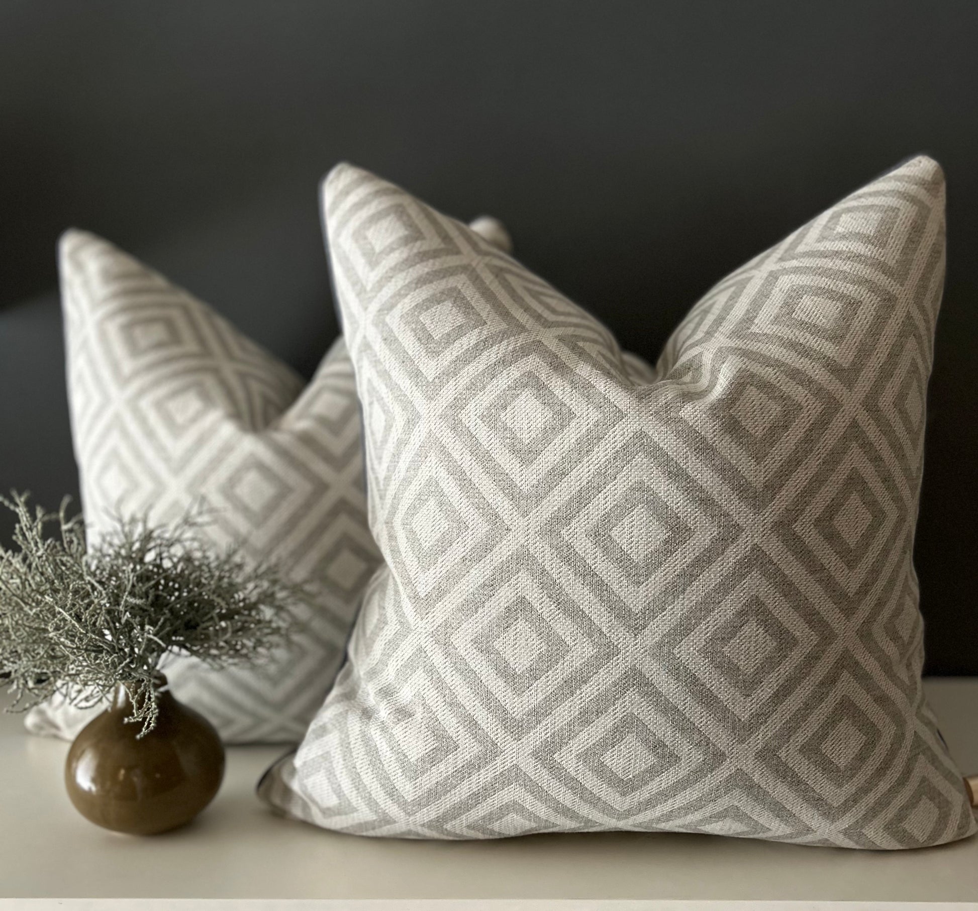 Realizzato in un pregiato tessuto misto lino, cotone e poliestere, presenta una texture marcata e quasi grezza che dona carattere e autenticità. Il motivo geometrico a rombi nei toni del grigio e panna si abbina facilmente a diversi stili d’arredo, dal moderno al rustico.