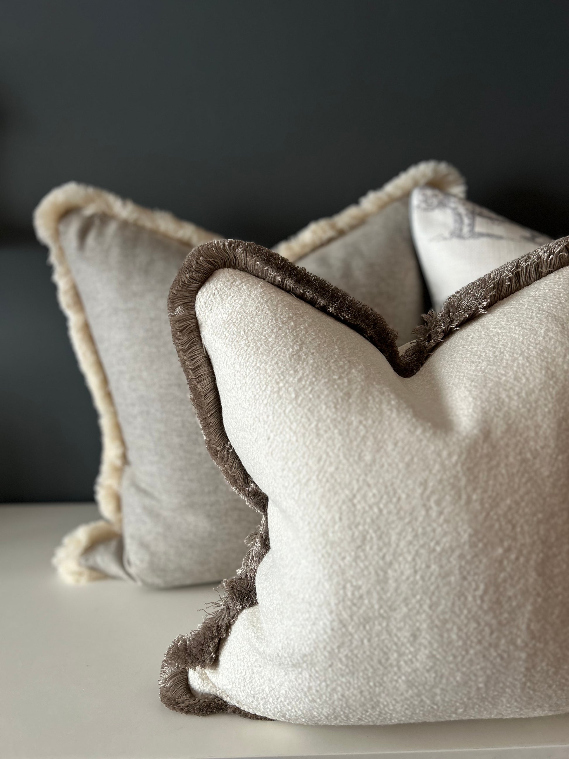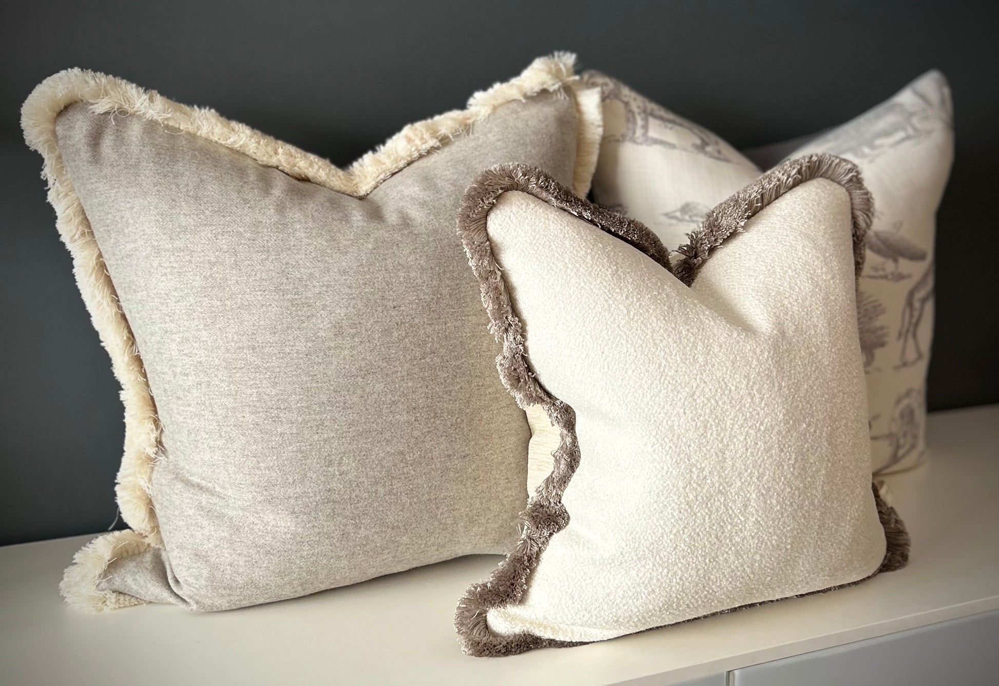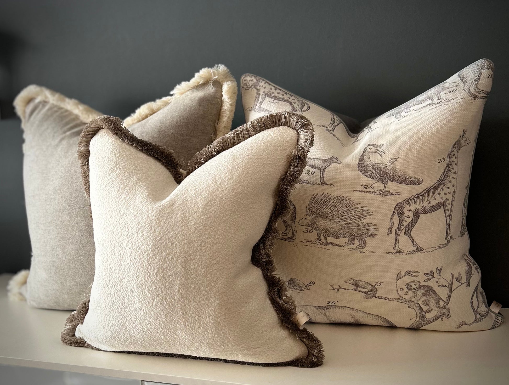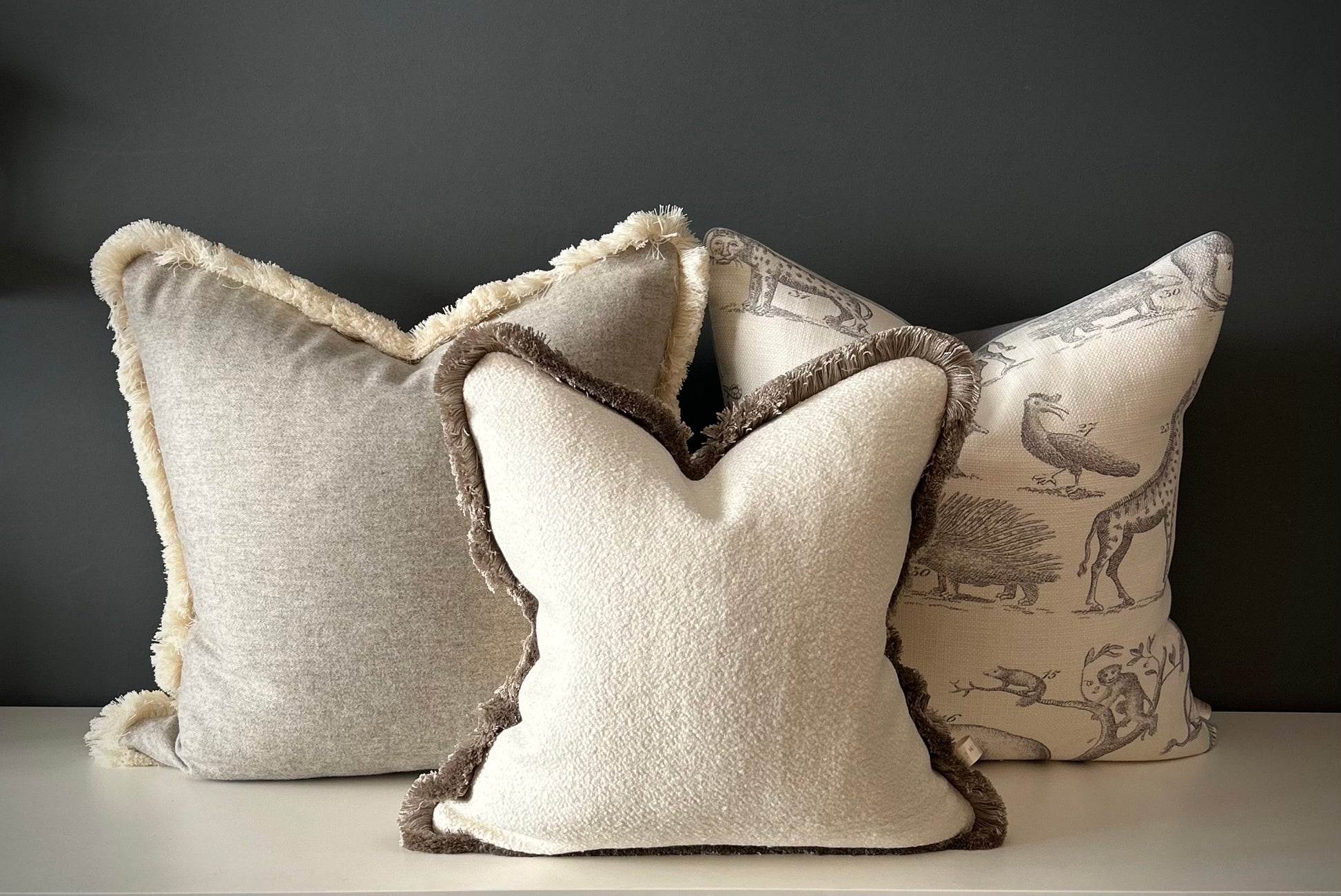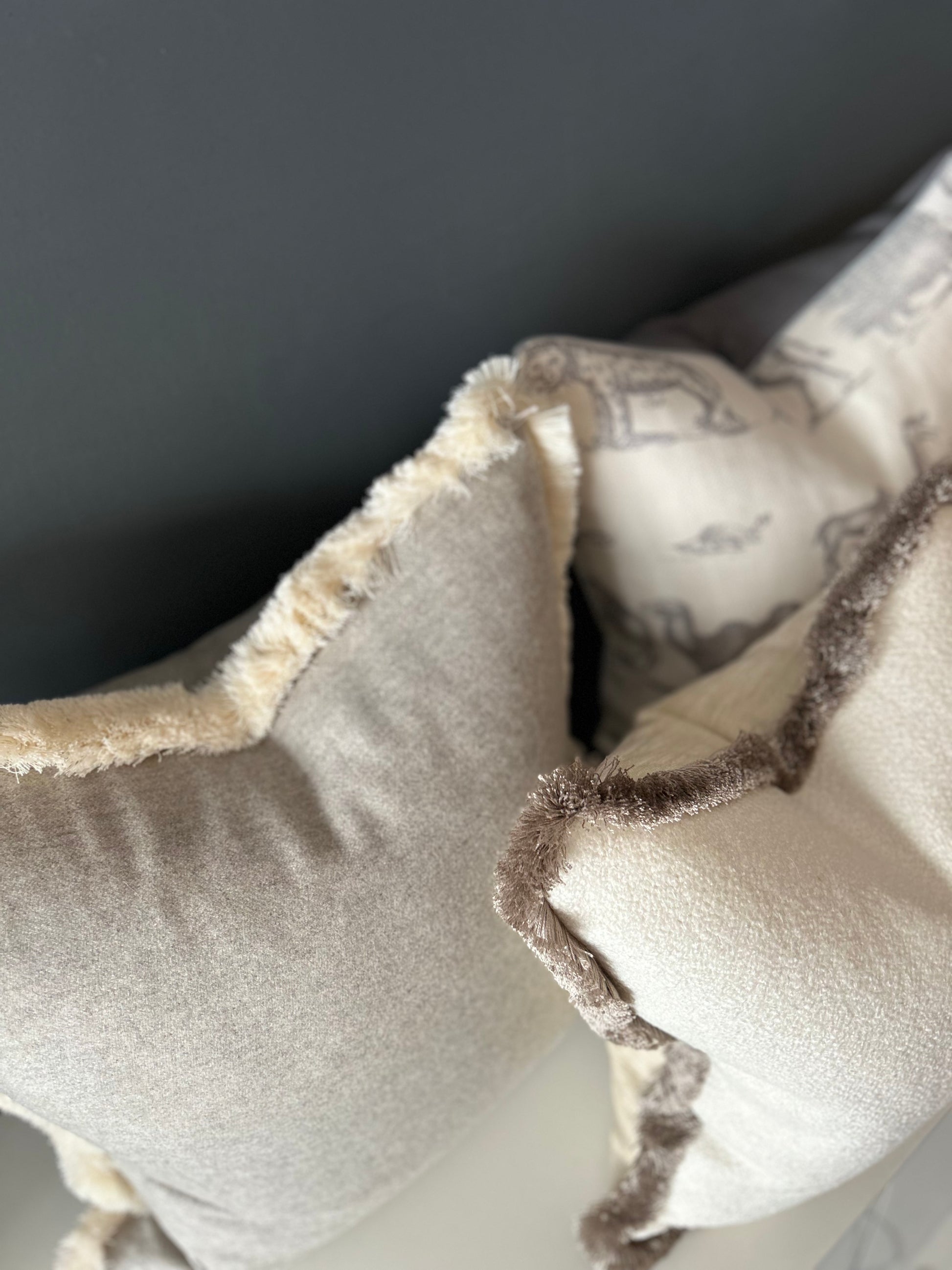 Un’elegante combinazione di cuscini nei toni tenui e rilassanti del panna, del tortora e del grigio, pensata per donare armonia e raffinatezza a qualsiasi ambiente. Questa combo è studiata secondo le principali regole di abbinamento dei tessuti, unendo diverse texture lussuose — bouclè, lino e mohair — che creano un equilibrio perfetto tra morbidezza, calore e diversità visiva.
